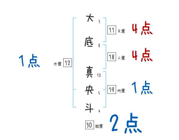天運![]() | 大底真央斗さんの天運は11画の4つ星!着実に富や地位を得る幸運な人生。 家系が持つ宿命的な運勢を表します。祖先から受け継いだ苗字ですので自分の力が及びません。家柄を象徴します。 |