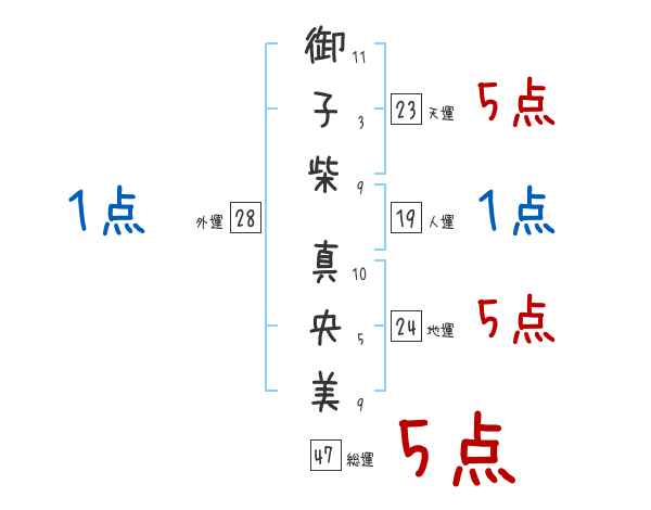 総運![]() | 御子柴真央美さんの総運は47画の5つ星!実力が開花し発展する円満な人生。財に恵まれる。 あなたの人生を表す1番重要な運勢です。生涯を通じて影響する総合運となり、主に50歳以降の晩年期に影響を及ぼします。 |