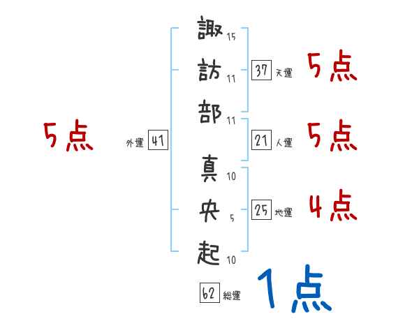 総運![]() | 諏訪部真央起さんの総運は62画の1つ星!困難なトラブルが多く精神的に疲労しないように気をつけましょう。 あなたの人生を表す1番重要な運勢です。生涯を通じて影響する総合運となり、主に50歳以降の晩年期に影響を及ぼします。 |