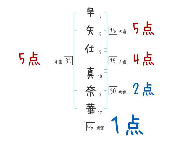 天運![]() | 早矢仕真奈華さんの天運は16画の5つ星!人望が厚く大きく発展する。逆転成功が見える。 家系が持つ宿命的な運勢を表します。祖先から受け継いだ苗字ですので自分の力が及びません。家柄を象徴します。 |