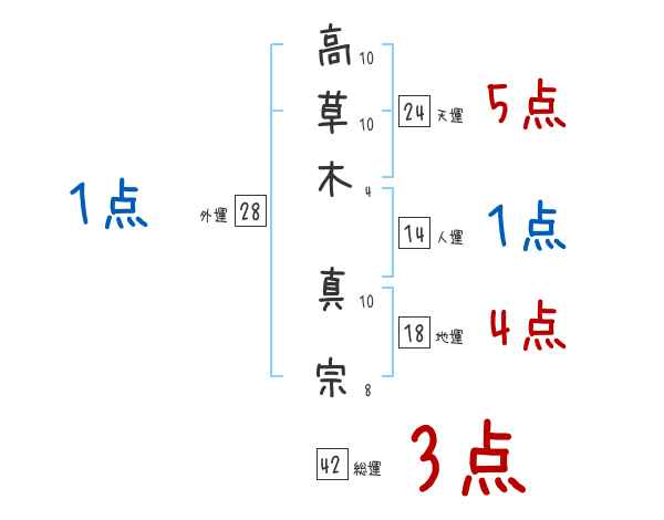 天運![]() | 高草木真宗さんの天運は24画の5つ星!家庭運が良く順調な人生。金運にも恵まれる。 家系が持つ宿命的な運勢を表します。祖先から受け継いだ苗字ですので自分の力が及びません。家柄を象徴します。 |