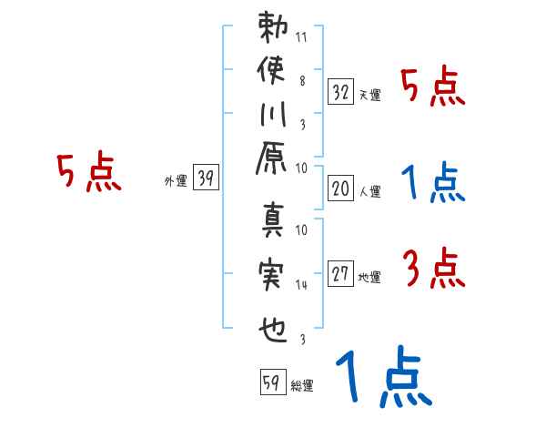 外運![]() | 勅使川原真実也さんの外運は39画の5つ星!社交性に優れ人望が厚い。人の上に立ち成功する。 生活面を象徴する運勢です。外部から受ける影響力を表し、結婚運、家庭運や職場、環境への順応性を表します。 |