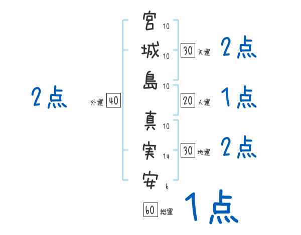 総運![]() | 宮城島真実安さんの総運は60画の1つ星!悲観的で迷いやすい。波乱が多く損をしないように。 あなたの人生を表す1番重要な運勢です。生涯を通じて影響する総合運となり、主に50歳以降の晩年期に影響を及ぼします。 |