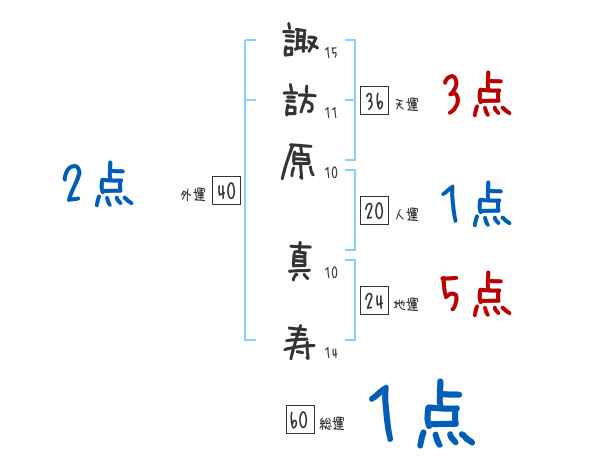 総運![]() | 諏訪原真寿さんの総運は60画の1つ星!悲観的で迷いやすい。波乱が多く損をしないように。 あなたの人生を表す1番重要な運勢です。生涯を通じて影響する総合運となり、主に50歳以降の晩年期に影響を及ぼします。 |