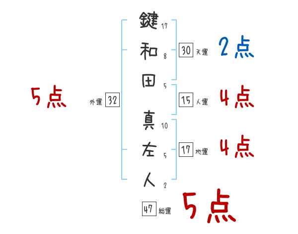 外運![]() | 鍵和田真左人さんの外運は32画の5つ星!柔軟性があり成功する。チャンスが多く金運が良い。 生活面を象徴する運勢です。外部から受ける影響力を表し、結婚運、家庭運や職場、環境への順応性を表します。 |