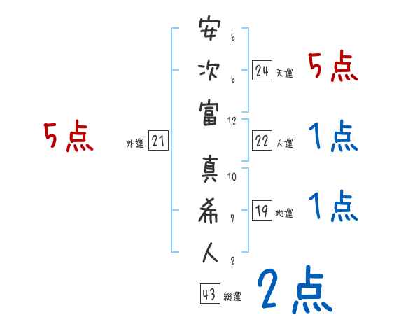 人運![]() | 安次富真希人さんの人運は22画の1つ星!努力することが苦手ないっぽう手先が器用。芸術性にも優れる。 性格や才能などを表す2番目に重要な運勢です。人間関係や協調性、社会的な成功に影響します。主に20歳から50歳ぐらいまでの中年期の運勢を表します。 |