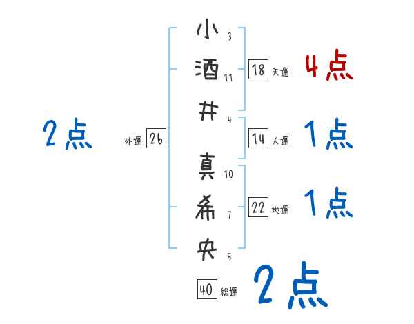 外運![]() | 小酒井真希央さんの外運は26画の2つ星!波瀾万丈かも。信頼できる人を大事にしましょう。 生活面を象徴する運勢です。外部から受ける影響力を表し、結婚運、家庭運や職場、環境への順応性を表します。 |