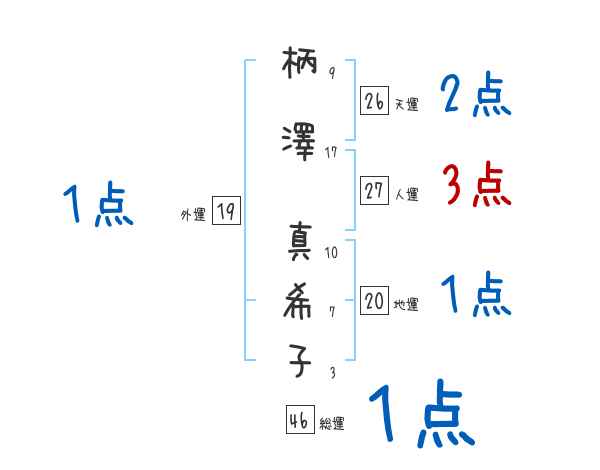 天運![]() | 柄澤真希子さんの天運は26画の2つ星!波瀾万丈かも。信頼できる人を大事にしましょう。 家系が持つ宿命的な運勢を表します。祖先から受け継いだ苗字ですので自分の力が及びません。家柄を象徴します。 |