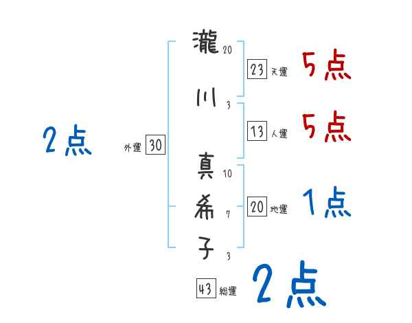 総運![]() | 瀧川真希子さんの総運は43画の2つ星!頑固な性格で独立心が強いかも。やや非現実的で浪費に注意しましょう。 あなたの人生を表す1番重要な運勢です。生涯を通じて影響する総合運となり、主に50歳以降の晩年期に影響を及ぼします。 |