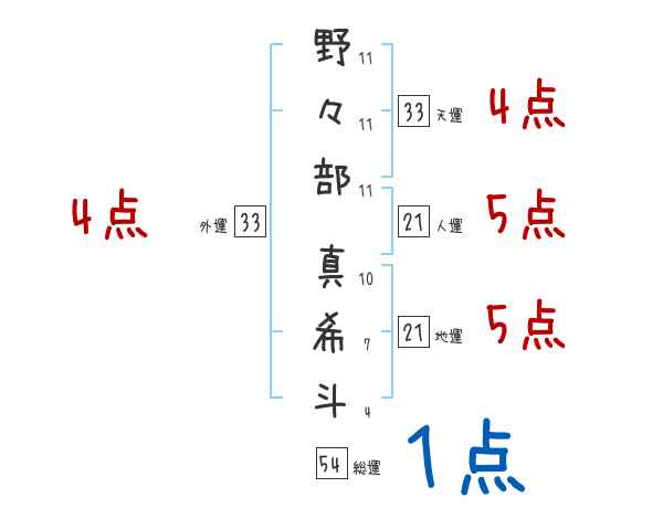 総運![]() | 野々部真希斗さんの総運は54画の1つ星!トラブルが多いかも。周りをよく見て協調して過ごしましょう。 あなたの人生を表す1番重要な運勢です。生涯を通じて影響する総合運となり、主に50歳以降の晩年期に影響を及ぼします。 |