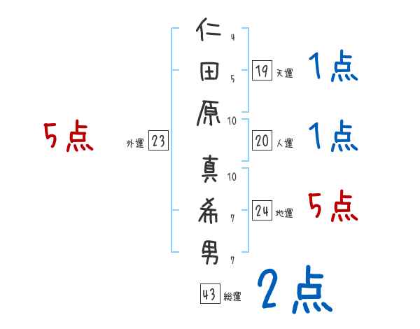 外運![]() | 仁田原真希男さんの外運は23画の5つ星!想像力に優れ活力がある。一代で成功し名誉を手に入れる。 生活面を象徴する運勢です。外部から受ける影響力を表し、結婚運、家庭運や職場、環境への順応性を表します。 |
