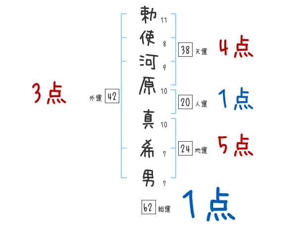 外運![]() | 勅使河原真希男さんの外運は42画の3つ星!病気に注意。多芸であるが消極的でおとなしい。 生活面を象徴する運勢です。外部から受ける影響力を表し、結婚運、家庭運や職場、環境への順応性を表します。 |