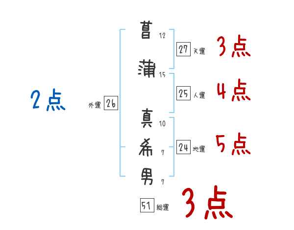 総運![]() | 菖蒲真希男さんの総運は51画の3つ星!変化が激しく、危険に注意。堅実な性格。 あなたの人生を表す1番重要な運勢です。生涯を通じて影響する総合運となり、主に50歳以降の晩年期に影響を及ぼします。 |