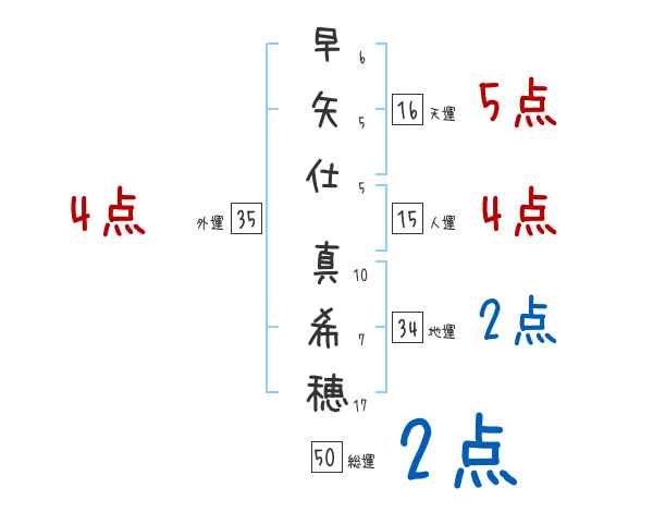 天運![]() | 早矢仕真希穂さんの天運は16画の5つ星!人望が厚く大きく発展する。逆転成功が見える。 家系が持つ宿命的な運勢を表します。祖先から受け継いだ苗字ですので自分の力が及びません。家柄を象徴します。 |