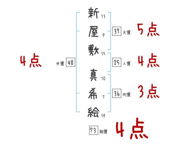 総運![]() | 新屋敷真希絵さんの総運は73画の4つ星!天徳のある人生。散財に注意すれば晩年幸福。 あなたの人生を表す1番重要な運勢です。生涯を通じて影響する総合運となり、主に50歳以降の晩年期に影響を及ぼします。 |