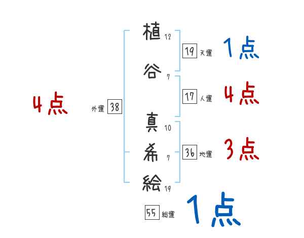 外運![]() | 植谷真希絵さんの外運は38画の4つ星!温厚な性格で技術的な才能を発揮する。職人的な仕事に向いている。 生活面を象徴する運勢です。外部から受ける影響力を表し、結婚運、家庭運や職場、環境への順応性を表します。 |