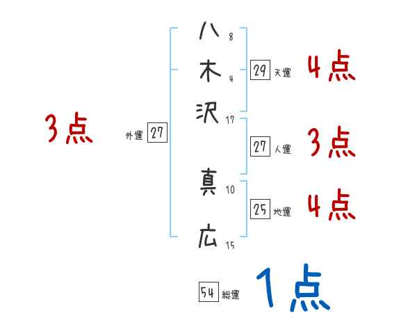 総運![]() | 八木沢真広さんの総運は54画の1つ星!トラブルが多いかも。周りをよく見て協調して過ごしましょう。 あなたの人生を表す1番重要な運勢です。生涯を通じて影響する総合運となり、主に50歳以降の晩年期に影響を及ぼします。 |