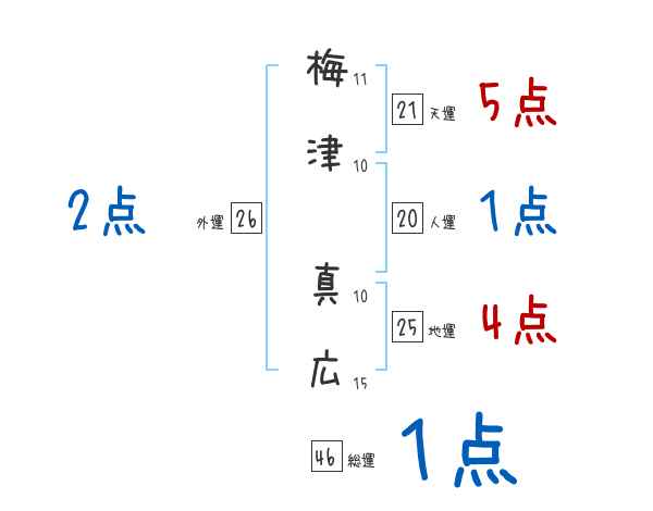 天運![]() | 梅津真広さんの天運は21画の5つ星!統率力がある。独立し成功する。名誉を手に入れる。 家系が持つ宿命的な運勢を表します。祖先から受け継いだ苗字ですので自分の力が及びません。家柄を象徴します。 |