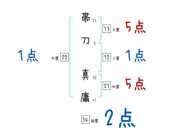 総運![]() | 帯刀真庸さんの総運は34画の2つ星!独創性に優れるが、自尊心が強く災難に注意しましょう。 あなたの人生を表す1番重要な運勢です。生涯を通じて影響する総合運となり、主に50歳以降の晩年期に影響を及ぼします。 |