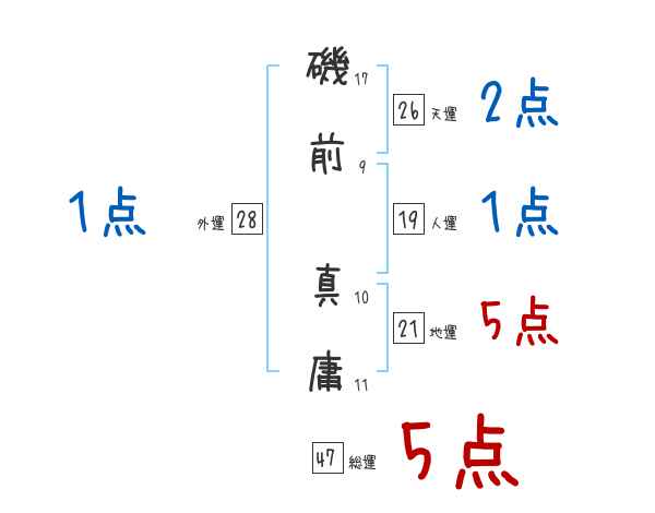 外運![]() | 磯前真庸さんの外運は28画の1つ星!家庭環境に注意。スポーツで活躍できる能力があるかも。 生活面を象徴する運勢です。外部から受ける影響力を表し、結婚運、家庭運や職場、環境への順応性を表します。 |