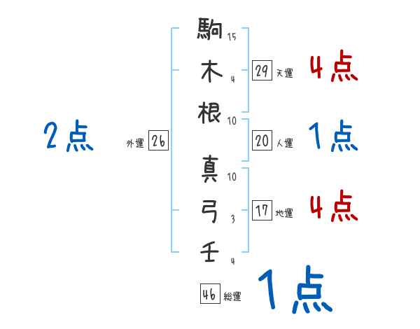 総運![]() | 駒木根真弓壬さんの総運は46画の1つ星!迷走することが多く苦労するかも。目先のことにとらわれないように。 あなたの人生を表す1番重要な運勢です。生涯を通じて影響する総合運となり、主に50歳以降の晩年期に影響を及ぼします。 |