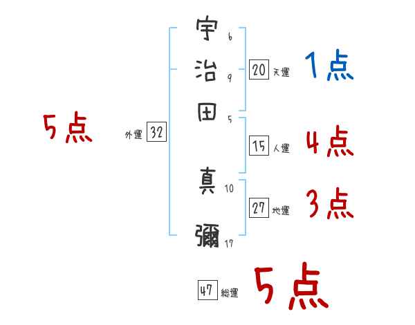 外運![]() | 宇治田真彌さんの外運は32画の5つ星!柔軟性があり成功する。チャンスが多く金運が良い。 生活面を象徴する運勢です。外部から受ける影響力を表し、結婚運、家庭運や職場、環境への順応性を表します。 |