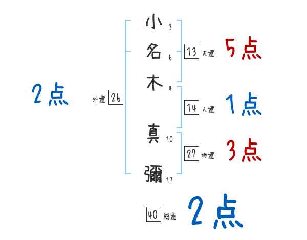 地運![]() | 小名木真彌さんの地運は27画の3つ星!頭脳明晰だが強情で摩擦が多い傾向。孤立に注意。 個性を表す基礎的な運勢です。性格形成や対人関係、行動力など家庭環境に影響されます。主に誕生してから20歳くらいまでの若年期の運勢を表します。 |