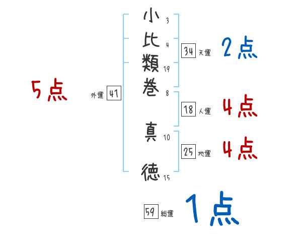 天運![]() | 小比類巻真徳さんの天運は34画の2つ星!独創性に優れるが、自尊心が強く災難に注意しましょう。 家系が持つ宿命的な運勢を表します。祖先から受け継いだ苗字ですので自分の力が及びません。家柄を象徴します。 |