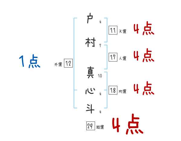 天運![]() | 戸村真心斗さんの天運は11画の4つ星!着実に富や地位を得る幸運な人生。 家系が持つ宿命的な運勢を表します。祖先から受け継いだ苗字ですので自分の力が及びません。家柄を象徴します。 |