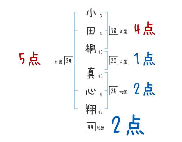外運![]() | 小田桐真心翔さんの外運は24画の5つ星!家庭運が良く順調な人生。金運にも恵まれる。 生活面を象徴する運勢です。外部から受ける影響力を表し、結婚運、家庭運や職場、環境への順応性を表します。 |