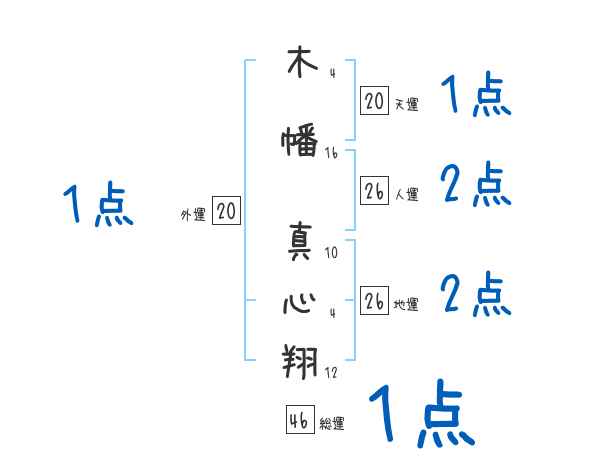 総運![]() | 木幡真心翔さんの総運は46画の1つ星!迷走することが多く苦労するかも。目先のことにとらわれないように。 あなたの人生を表す1番重要な運勢です。生涯を通じて影響する総合運となり、主に50歳以降の晩年期に影響を及ぼします。 |