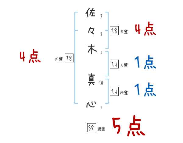 総運![]() | 佐々木真心さんの総運は32画の5つ星!柔軟性があり成功する。チャンスが多く金運が良い。 あなたの人生を表す1番重要な運勢です。生涯を通じて影響する総合運となり、主に50歳以降の晩年期に影響を及ぼします。 |