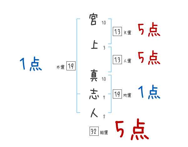 総運![]() | 宮上真志人さんの総運は32画の5つ星!柔軟性があり成功する。チャンスが多く金運が良い。 あなたの人生を表す1番重要な運勢です。生涯を通じて影響する総合運となり、主に50歳以降の晩年期に影響を及ぼします。 |