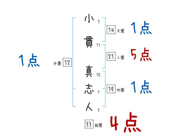 天運![]() | 小貫真志人さんの天運は14画の1つ星!人に対して優しいがストレスを溜め込みがち。人間関係のトラブルを避けるよう気をつけましょう。 家系が持つ宿命的な運勢を表します。祖先から受け継いだ苗字ですので自分の力が及びません。家柄を象徴します。 |