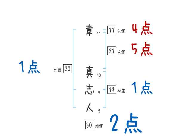 人運![]() | 章真志人さんの人運は21画の5つ星!統率力がある。独立し成功する。名誉を手に入れる。 性格や才能などを表す2番目に重要な運勢です。人間関係や協調性、社会的な成功に影響します。主に20歳から50歳ぐらいまでの中年期の運勢を表します。 |