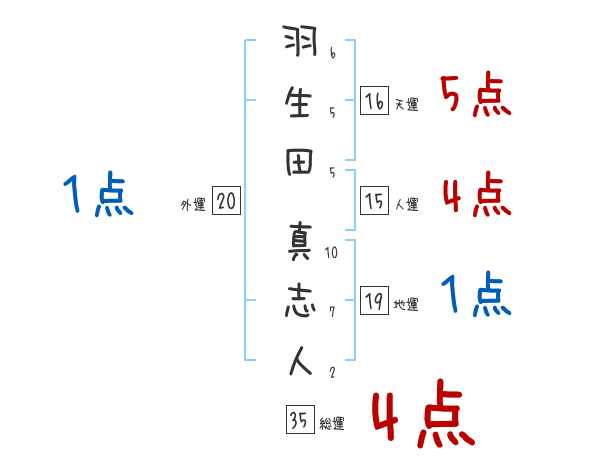 天運![]() | 羽生田真志人さんの天運は16画の5つ星!人望が厚く大きく発展する。逆転成功が見える。 家系が持つ宿命的な運勢を表します。祖先から受け継いだ苗字ですので自分の力が及びません。家柄を象徴します。 |