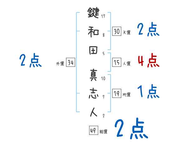 天運![]() | 鍵和田真志人さんの天運は30画の2つ星!浮き沈みの激しさに注意しましょう。 家系が持つ宿命的な運勢を表します。祖先から受け継いだ苗字ですので自分の力が及びません。家柄を象徴します。 |