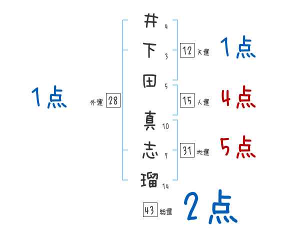 天運![]() | 井下田真志瑠さんの天運は12画の1つ星!簡単な失敗で諦めてしまいやすいかも。着実に行動すると良いでしょう。 家系が持つ宿命的な運勢を表します。祖先から受け継いだ苗字ですので自分の力が及びません。家柄を象徴します。 |