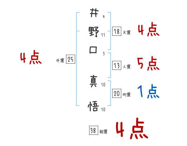天運![]() | 井野口真悟さんの天運は18画の4つ星!情熱的で剛気。忍耐力があり信頼される。 家系が持つ宿命的な運勢を表します。祖先から受け継いだ苗字ですので自分の力が及びません。家柄を象徴します。 |