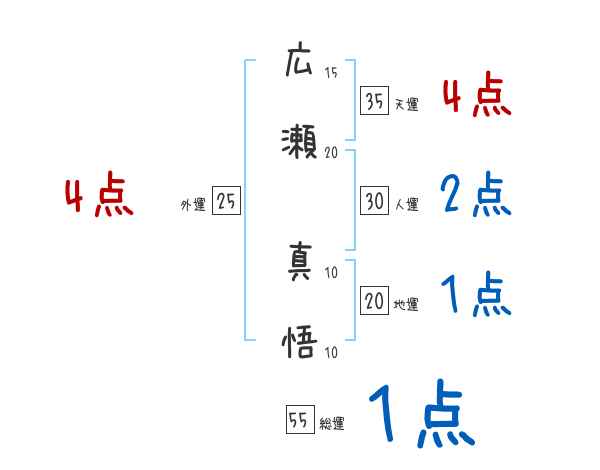 天運![]() | 広瀬真悟さんの天運は35画の4つ星!温厚な性格で感受性が高い。穏和な性格で人望が厚い。 家系が持つ宿命的な運勢を表します。祖先から受け継いだ苗字ですので自分の力が及びません。家柄を象徴します。 |