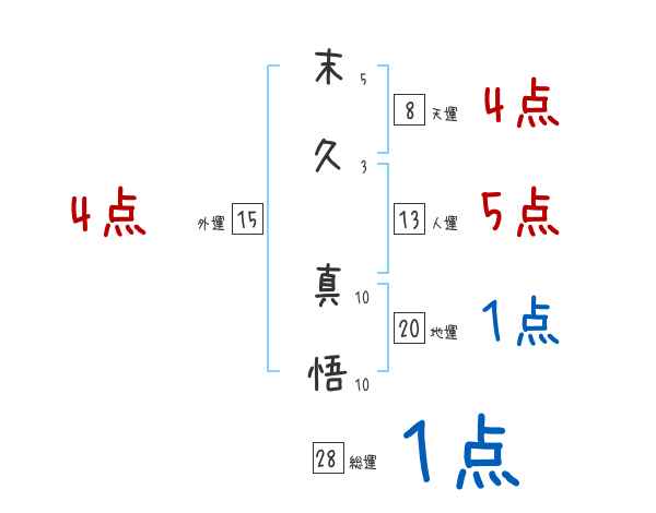 総運![]() | 末久真悟さんの総運は28画の1つ星!家庭環境に注意。スポーツで活躍できる能力があるかも。 あなたの人生を表す1番重要な運勢です。生涯を通じて影響する総合運となり、主に50歳以降の晩年期に影響を及ぼします。 |