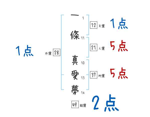 天運![]() | 一條真愛夢さんの天運は12画の1つ星!簡単な失敗で諦めてしまいやすいかも。着実に行動すると良いでしょう。 家系が持つ宿命的な運勢を表します。祖先から受け継いだ苗字ですので自分の力が及びません。家柄を象徴します。 |