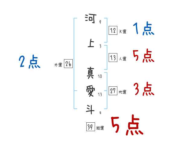 外運![]() | 河上真愛斗さんの外運は26画の2つ星!波瀾万丈かも。信頼できる人を大事にしましょう。 生活面を象徴する運勢です。外部から受ける影響力を表し、結婚運、家庭運や職場、環境への順応性を表します。 |