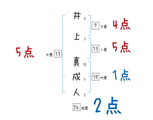 天運![]() | 井上真成人さんの天運は7画の4つ星!強い意志や信念を持ち独立心が強い。自立する。 家系が持つ宿命的な運勢を表します。祖先から受け継いだ苗字ですので自分の力が及びません。家柄を象徴します。 |
