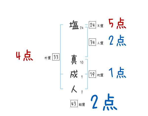 外運![]() | 塩真成人さんの外運は33画の4つ星!権力志向でプライドが高い。勇気があり運を切り開き成功する。 生活面を象徴する運勢です。外部から受ける影響力を表し、結婚運、家庭運や職場、環境への順応性を表します。 |