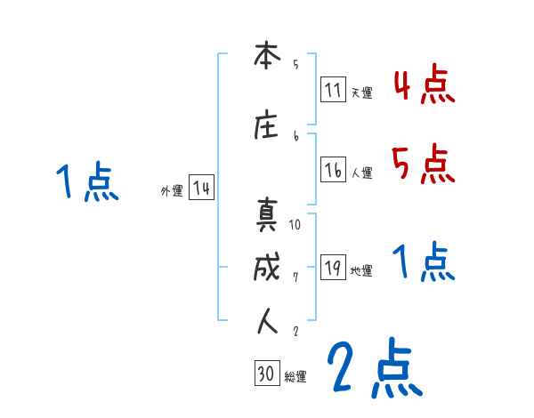 人運![]() | 本庄真成人さんの人運は16画の5つ星!人望が厚く大きく発展する。逆転成功が見える。 性格や才能などを表す2番目に重要な運勢です。人間関係や協調性、社会的な成功に影響します。主に20歳から50歳ぐらいまでの中年期の運勢を表します。 |