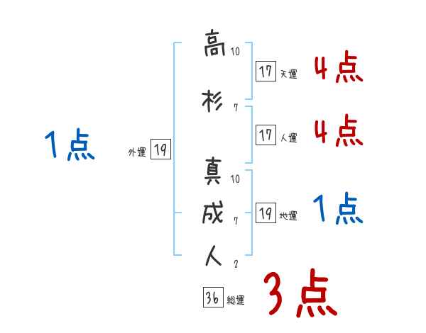 総運![]() | 高杉真成人さんの総運は36画の3つ星!先見性が豊かです。多少神経質で苦労することも。 あなたの人生を表す1番重要な運勢です。生涯を通じて影響する総合運となり、主に50歳以降の晩年期に影響を及ぼします。 |