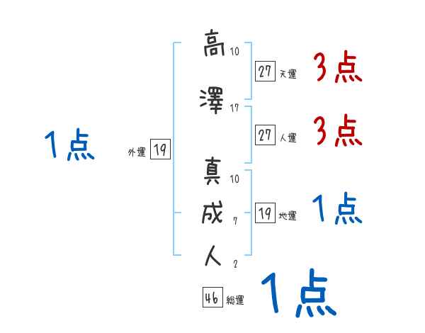 総運![]() | 高澤真成人さんの総運は46画の1つ星!迷走することが多く苦労するかも。目先のことにとらわれないように。 あなたの人生を表す1番重要な運勢です。生涯を通じて影響する総合運となり、主に50歳以降の晩年期に影響を及ぼします。 |