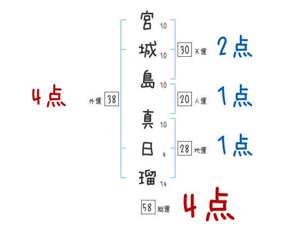 総運![]() | 宮城島真日瑠さんの総運は58画の4つ星!安定した生活。大器晩成タイプ。 あなたの人生を表す1番重要な運勢です。生涯を通じて影響する総合運となり、主に50歳以降の晩年期に影響を及ぼします。 |