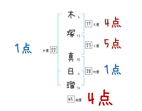 外運![]() | 木塚真日瑠さんの外運は22画の1つ星!努力することが苦手ないっぽう手先が器用。芸術性にも優れる。 生活面を象徴する運勢です。外部から受ける影響力を表し、結婚運、家庭運や職場、環境への順応性を表します。 |